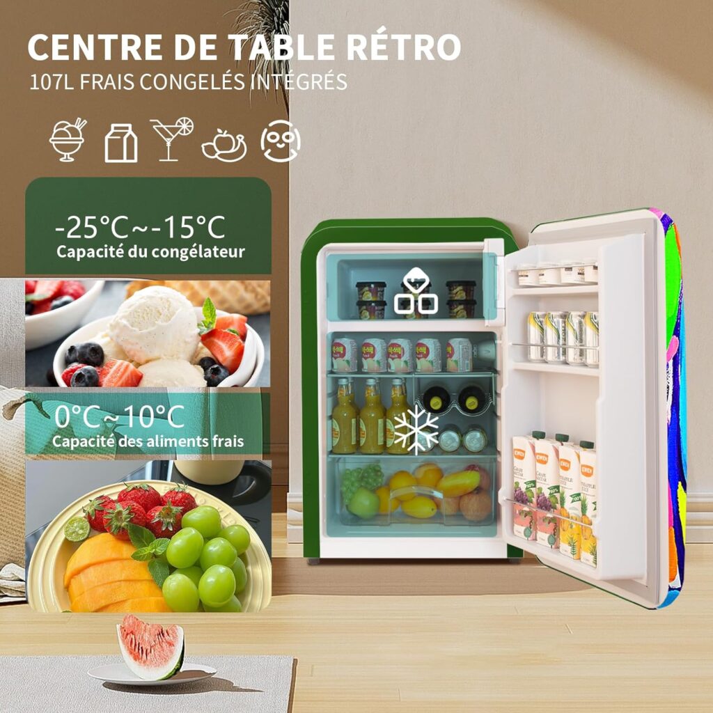 Le HCK 107L Rétro est un hommage aux années 50. C’est le seul modèle de la gamme à proposer un vrai compartiment freezer, ce qui en fait un excellent choix pour un studio d’étudiant ou une cuisine d’été.